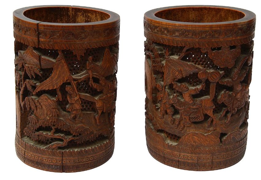 Condition:One brush pot with shrinkage cracks, small chips and losses. The other is good condition but with some minor shrinkage cracks