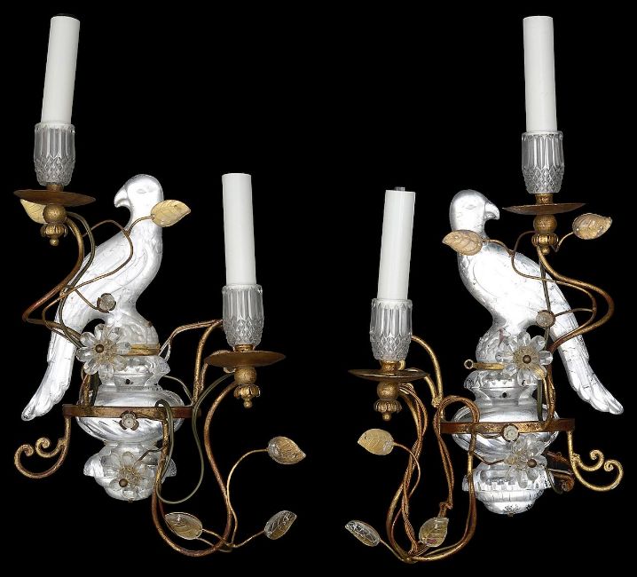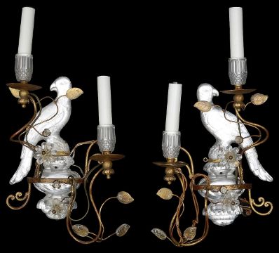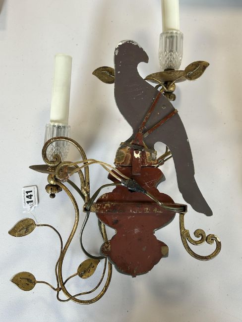 A pair of French two light crystal and gilt painted metal 'Parrot' wall appliques c.1960