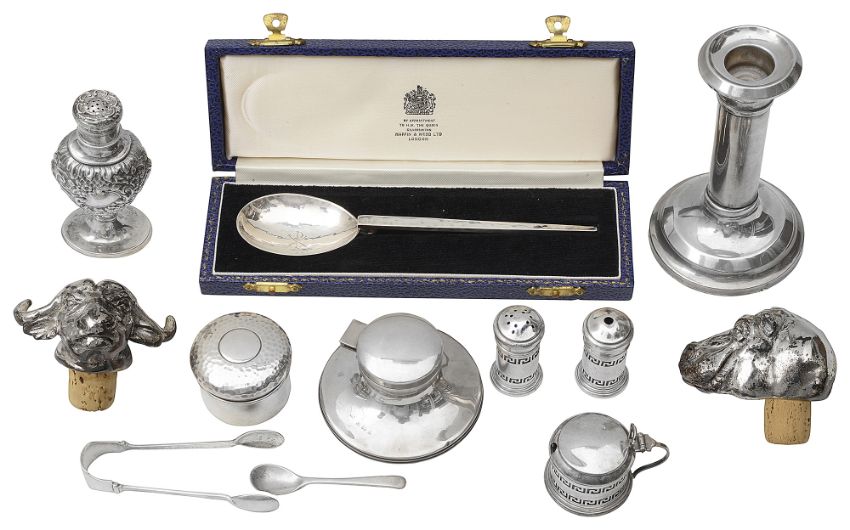 to include a cased replica of the Earliest Christening spoon, Birmingham, 1977, Mappin & Webb, a three piece cruet set pierced with Greek Key design, a capstan inkwell, a pair of novelty African hippopotamus and buffalo head bottle stoppers, stamped Afrisilver Sterling silver, filled,a candlestick with weighted base, etc. (qty)