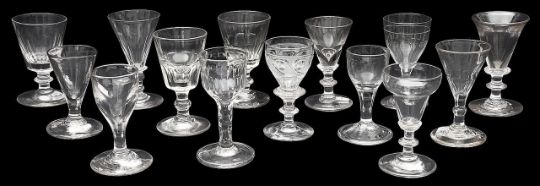 to include a plain stem dram glass engraved with a bird and floral spray on a folded foot, a facet stem dram glass with funnel shaped bowl moulded with flutes engraved with OXO border on a firing foot, a wine glass engraved Kitt Hill Hunt 1802, a pan top dram glass, two deceptive dram glasses with conical bowls, a Regency glass cut with a band of stylised peacock feathers and seven other glasses, (14)