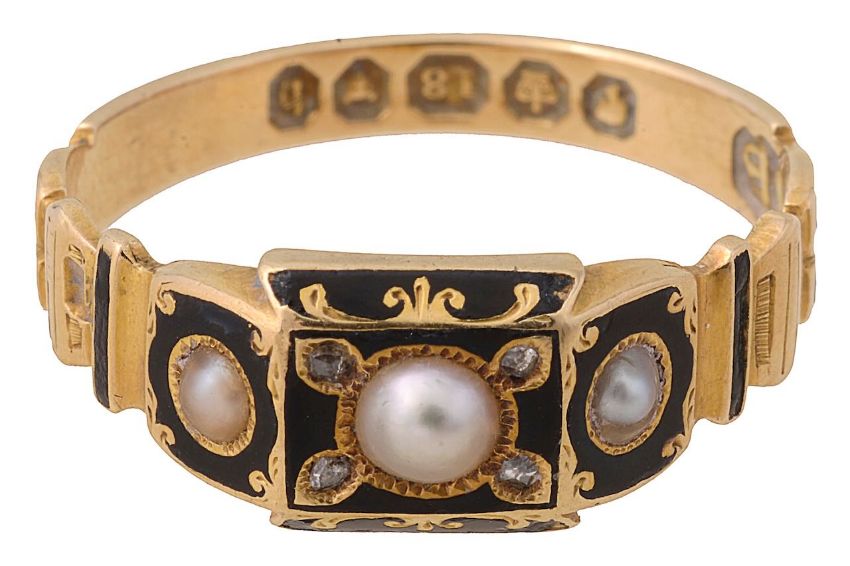 A mid Victorian pearl and enamel mourning ringthe tapering 18ct yellow gold band with black enamel decoration, three half pearls and diamond detail, London hallmark for 1863ring size M, 2.9gCondition:Overall condition good/ very good commensurate with ageMinor indent to upper shank and very slight enamel loss to decoration on lower shank