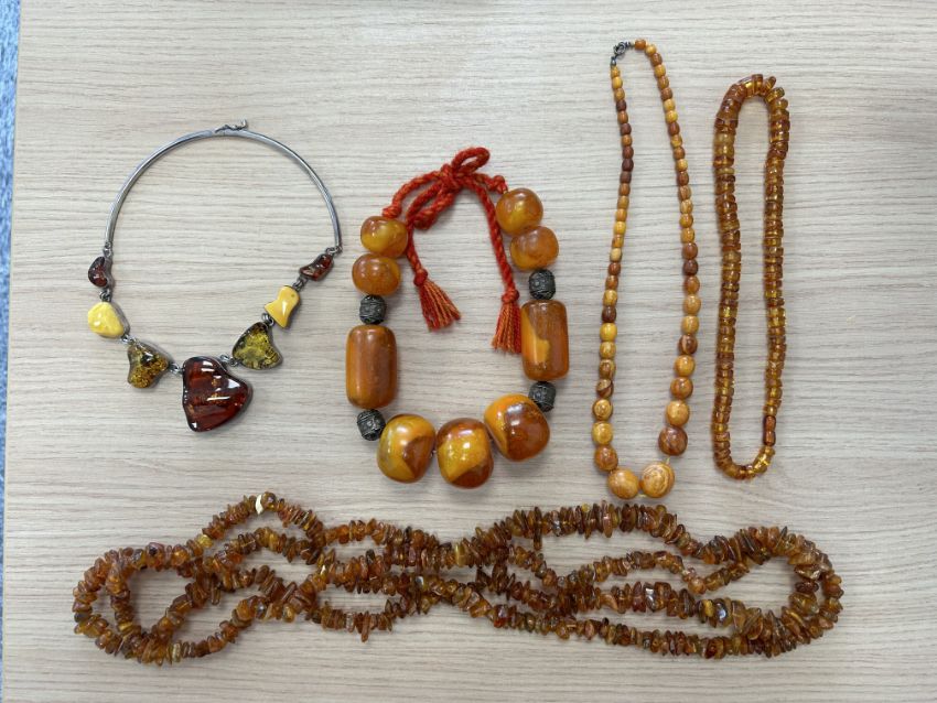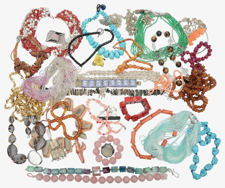 A collection of artisanal silver and semi precious stone jewellery and costume to include a chunky watermelon tourmaline and silver bead necklace and pale green hardstone necklace and two other hardstone and silver necklaces by Simone Micallef, a carved ruby bead necklace, a graduated jade and rock crystal necklace and a graduated turquoise pebble necklace all in Talisman Gallery Boxes, Folli Follie silver double chain necklace and triple chain bracelet with pouches and in original boxes, a silver and amber necklace, a coral and pink hardstone chip, freshwater pearl and glass bead collar necklace in a box stamped Palizzi, a Persian silver and enamel panel bracelet, a chunky faceted rose quartz bead necklace and bracelet, coral bead double row necklace, a chunky coral bracelet, chunky rock crystal and tigers eye bead necklace, another turquoise pebble necklace etc., (qty) various Condition:Good condition commensurate with ageWeight of graduated amber bead necklace  27.3gWeight of clear round amber bead neckalce 29gWeight of chunky bead neckalce, possible reconstituted amber, we cannot guarantee this is amber,  167gweight of long amber chip bead necklace 121.2gWeight of silver and amber necklace 61.9g