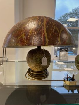 both of spherical form fitted with domed shades, of which one pierced, decorated with spatteredd abstract decoration, one baring handwritten label Val Gould (2)