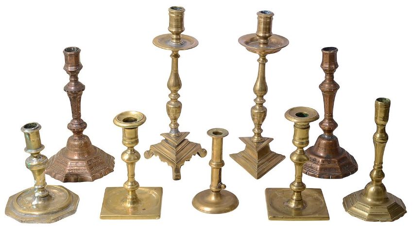 Condition:One bell metal candlestick has a solder repair. Square base candlesticks - one with old repair to base. Solder to stem of the taller candlestick with triangular base.