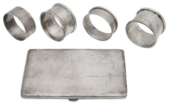 rectangular with textured decoration, interior gilt, together with four various napkin rings, (5)