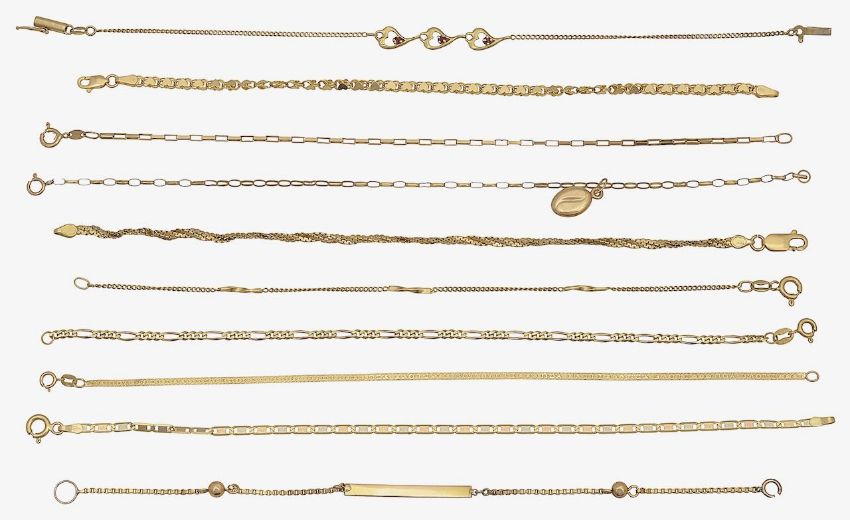 total approx. lengths 15.7-18cm, total approx. weight of "750" 13g, total approx. weight of "14K" 2.2g, total approx. weight of hallmarked gold 1.2g, total approx. weight of "9c" 1.1g, total approx. weight of unmarked bracelet 2.1g