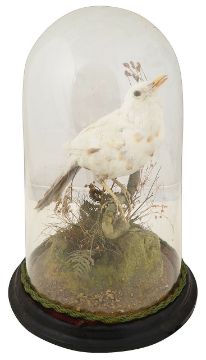 Taxidermy. A Victorian leucistic blackbird under dome