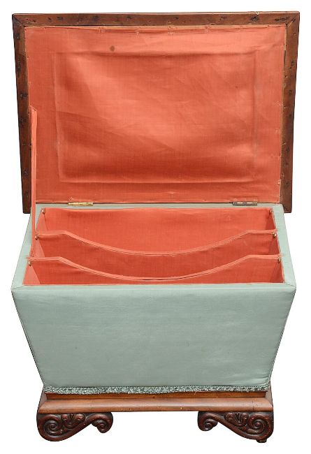 Condition:Fabric with marks and occasional stains. Corner joints to edge of lid have moved and right had side has a small repair otherwise frame sound. Some old worm holes to foot blocks. One has been reglued