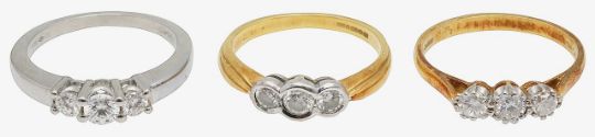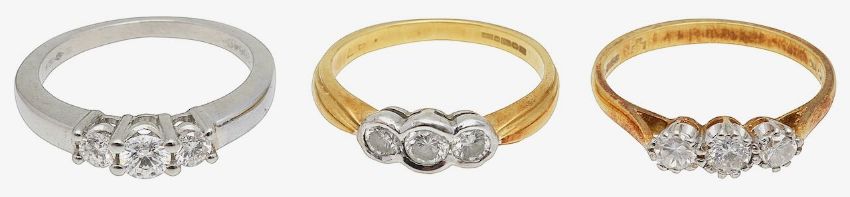 a three brilliant-cut diamond and platinum ring, and two three brilliant-cut diamond and 18ct yellow gold rings, all hallmarked (3)
