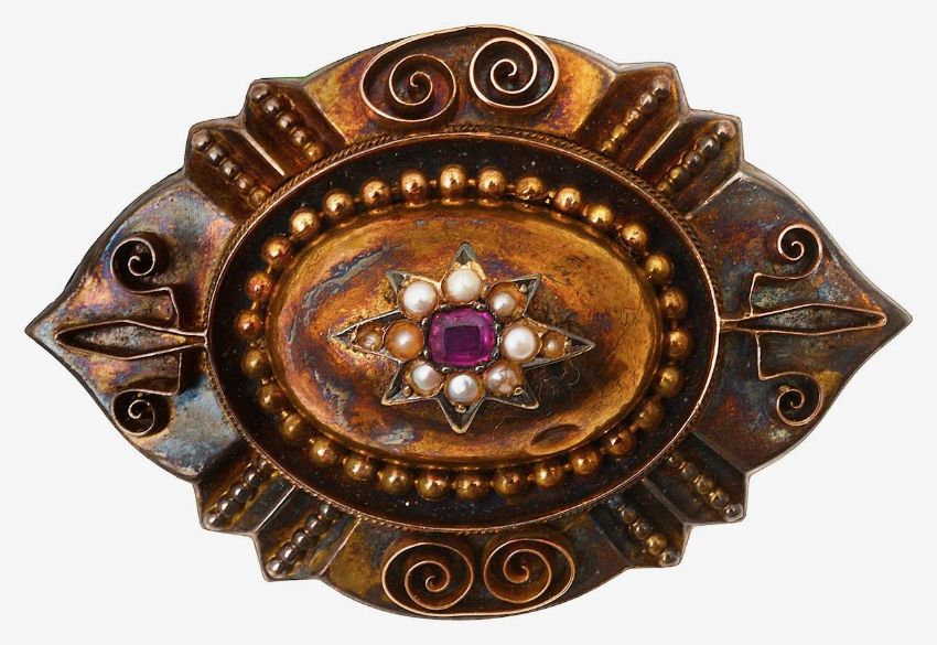 featuring a raised oval boss, star set, split pearl and ruby cluster, an elliptical boarder decorated with lines of bead and twisted wires to a closed gold back ground with scroll and bead work, the reverse side of the brooch is of plain gold with a vacant glazed oval section to the centre, fitted with a pin clasp.