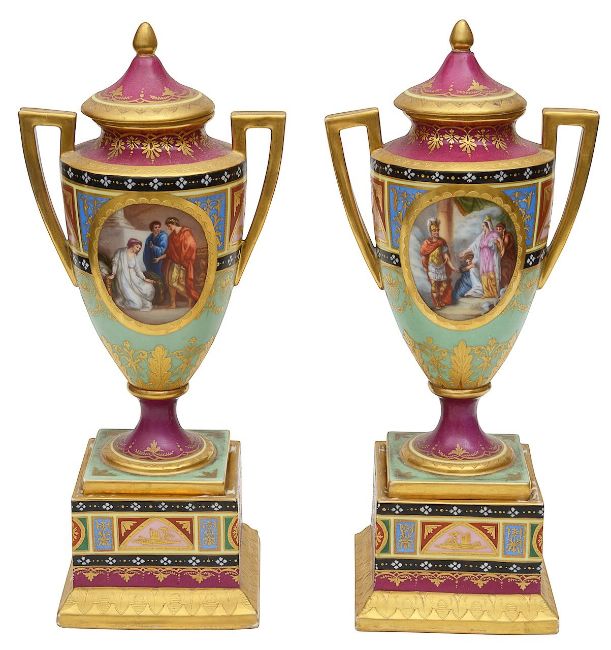 A pair of Royal Vienna porcelain twin handled pedestal vases and covers c.1900