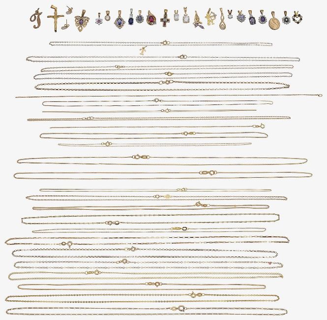 total approx. weight of 18ct gold 2.6g, total approx. weight of chains marked "585" and "14K" 1.8g, total approx. weight of chains marked "10K" 1.8g, total approx. weight of 9ct gold 20.6g, total approx. weight of chains marked "375" and "9ct" 11g, total approx. weight of unmarked chains 3g