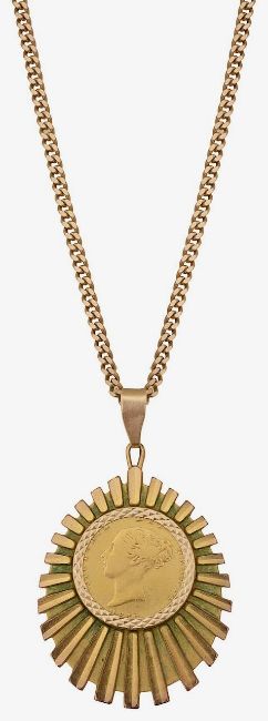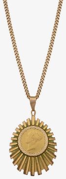 dated 1856, young head facing left, crowned shield to rev., set within a 9ct loose radiating border, stamped with hallmarks, suspended from a 9ct gold flattened curb-link chain, stamped with hallmarks