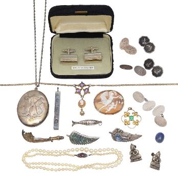 including; a cameo brooch, depicting winged figures; an open work pendant, with a green paste setting, stamped "9ct"; a group of cufflinks, of varying shapes and designs; a cameo and purple gem set necklace; a string of cultured pearls; a large oval locket suspended from a chain, chased with initials; a blue cabochon bead; two brooches stamped "Sterling"; a pair of earrings in the form of a deity, stamped "China Silver, a silver ingot pendant, stamped with hallmarks; a pair of rectangular cufflinks, chased with an abstract design and other items (qty)