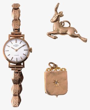 first shield form, set with a single diamond, scroll bail with suspension loop, Chester hallmarks, together with a Springbok charm with suspension loop stamped 9ct and a lady's 9ct gold manual wind Rotary wristwatch on an associated rolled gold bracelet, (3)