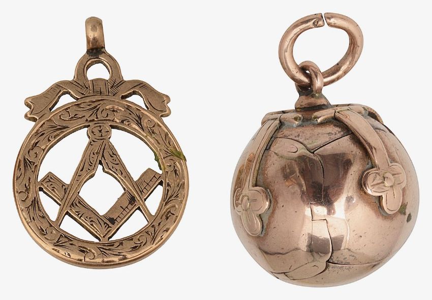 15ct gold Masonic fob pendant, stamped with hallmarks and Masonic spherical ball fob with four articulated arms opening to reveal pyramids in the form of a cross engraved with Masonic symbols (2)