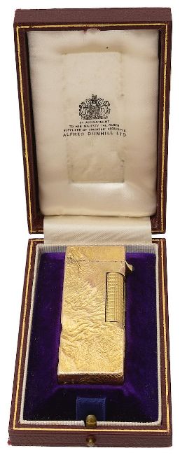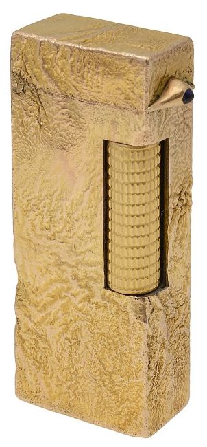 A 9ct gold mounted Dunhill 'Rollagas' lighter.With textured finish, in its original fitted case.Hallmarked Alfred Dunhill, London, 1964height 6.5cm, total weight 106.7gCondition:Wear consistent with use.Untested, will need a flint.Please note we are unable to ship this lot