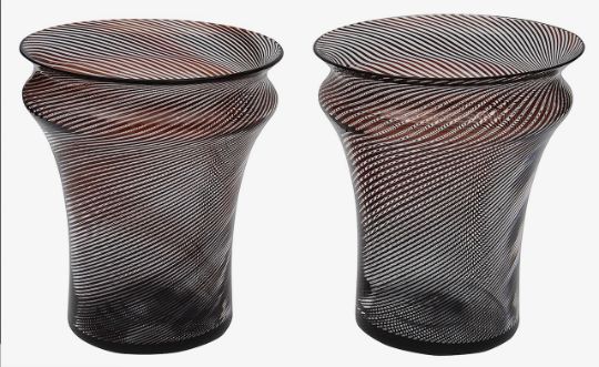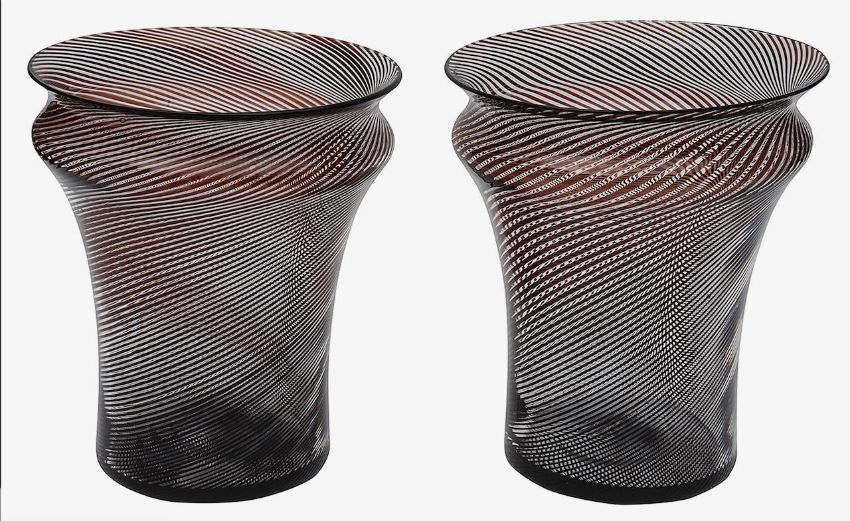 circa 1968, clear glass vases with red spiral cane decoration, etched signature to base Asti Venini Murano, (2)