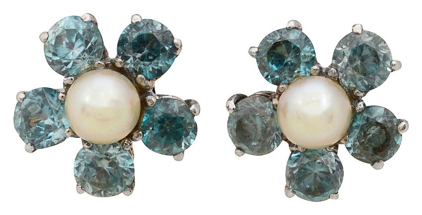 A pair of blue zircon and cultured pearl earringscentral cultured pearl set above a round brilliant-cut blue zircon surround, with twist backs, stamped "14K"total approx. weight 5.9gCondition:Attractive earrings in good condition. Each earring diameter approx 12.4mm Zircons bright with good well matched saturation