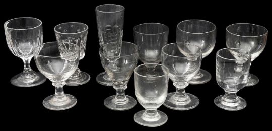 to include a rummer with deceptive bowl engraved "Stolen from the Rose Great Wylet Street', three other rummers with deceptive bowls, a rummer with ogee bowl, a Victorian moulded pub rummer, a Victorian tall ale glass, three pub rummers etc., (11)