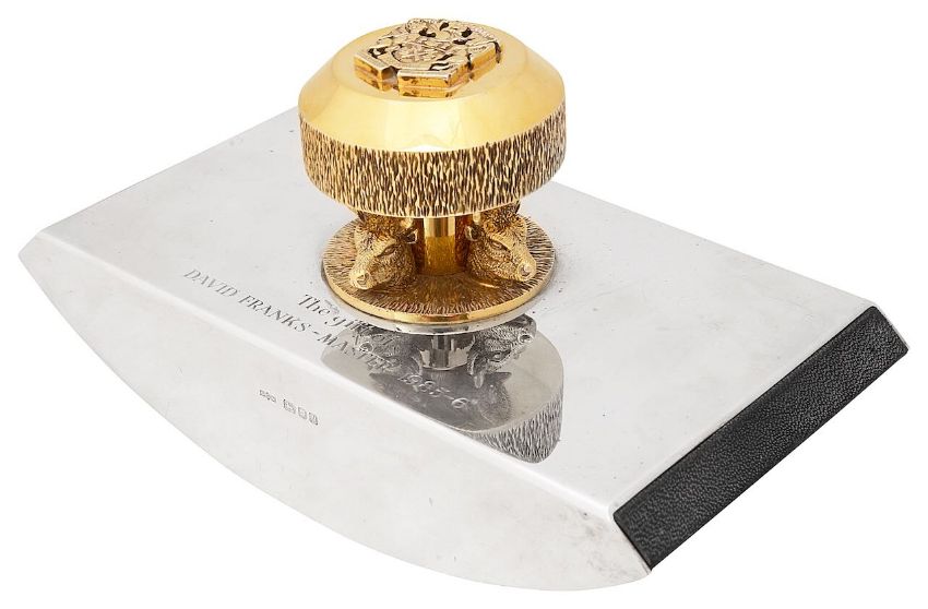 the central gilt circular handle with textured sides and raised applied Arms of the Worshipful Company of Butchers, raised on a circular textured base with four bulls heads, presentation inscription 'The gift of David Franks - Master 1985-6'