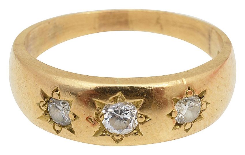 featuring three round brilliant-cut diamonds, set within 18ct gold shank, stamped with hallmarks