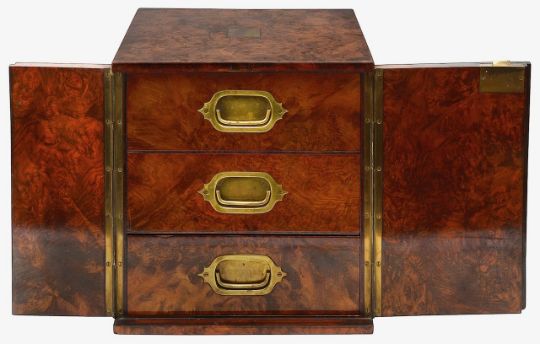 the twin doors enclosing three cedar drawers with divisions, sunken brass carrying handles to sides, the locked stamped Bramah