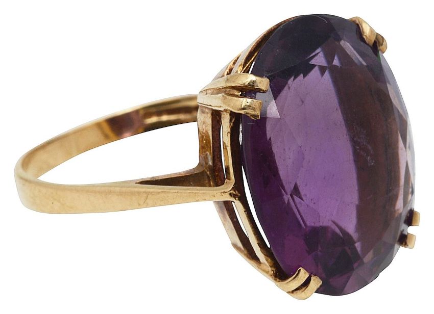 An amethyst single stone ringthe oval mixed-cut amethyst double claw-set to the tapering 9ct yellow gold shank, hallmarkedring size M, 4.1gCondition:Overall condition goodAmethyst: bright, good hue, with some minor typical tiger stripes