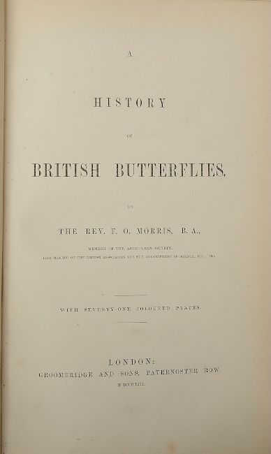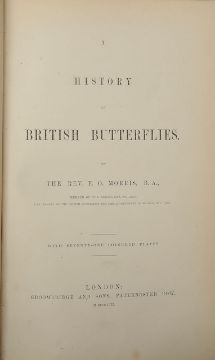Morris., Rev. Francis Orpen. Three copies of A History of British Butterfliesfirst A History of British Butterflies, London, Groombridge & Sons, 1853, first edition 71 lithograph plates with hand colouring and tissue guards 8vo, gilt edged, original full grained dark green blind tooled and pictorial gilt tooled pictorial decoration to boards and spine , bound together with Aphorismata Entomologica "Cavendo Tutus" pp. 29 second London, 1853, blue cloth, third, eighth edition, London, John C. Nimmo 1895, 79 hand coloured lithograph plates, 4to., bookplate for George A. R. Phillips contemporary tan half morocco with cloth boards (3)Condition:first occasional v light spotting but overall good Aphorismata Entomologica with foxing to both plates a first page. Binding Second some spotting to blanks occasional marks third Good condition