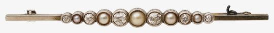 A half pearl and diamond-set bar broochthe centre collet-set with graduated alternating half pearls of varying hues and brilliant-cut diamondslength 6.3g, 4.5gCondition:overall condition fair/good - some wear on a few collet settings Diamonds: mixed cuts with fair/reasonable colour and clarity