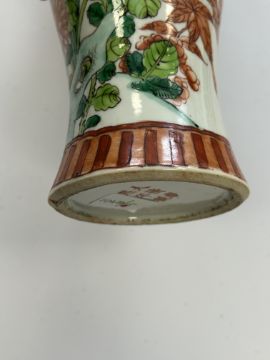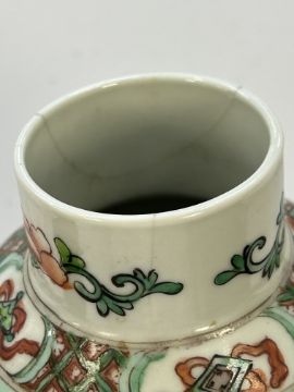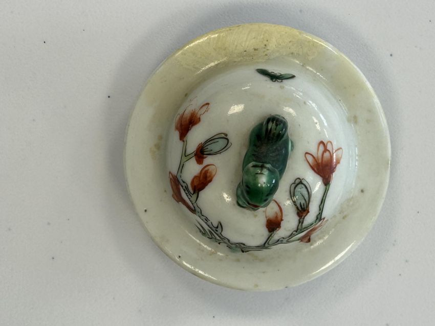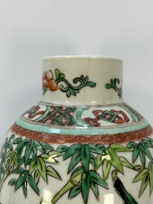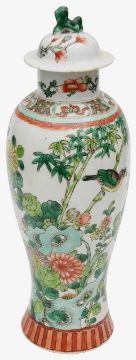 of inverted baluster form, decorated with birds, bamboo and flowers, the domed cover with a Dog of Foo finial, six character mark in red