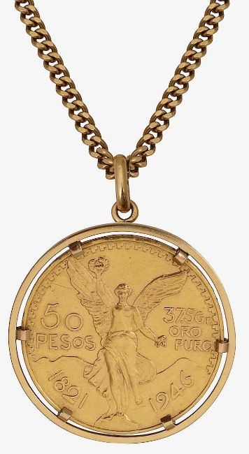 A Mexican 50 pesos coin mounted as a pendant with chain