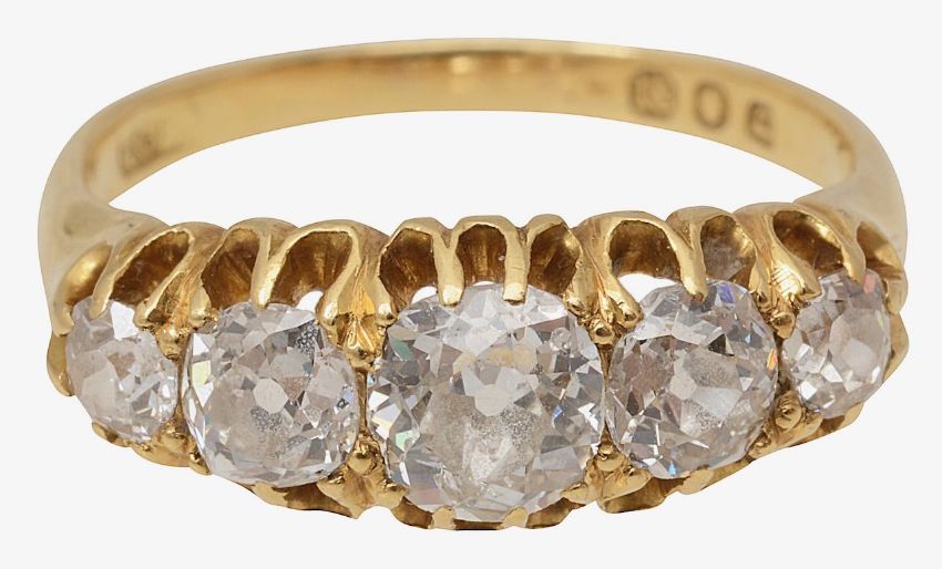 A late Victorian five stone diamond ringthe graduated old brilliant-cut diamonds to the 18ct yellow gold setting, London hallmarkring size L, 4.1gCondition:Overall condition good/very good. little sign of wear.Diamonds: bright, with largish culets, reasonable/good colour and clarity