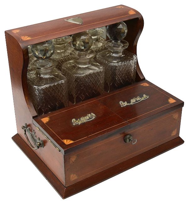 Condition:Commensurate with age. All three bottles with occasional fleabite chips. Some parts of the lettering of cigarettes is no longer present. Key present and works. Silver plated shield escutcheon rubbed
