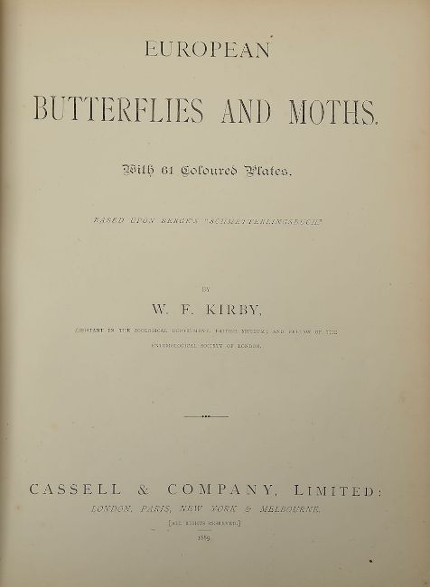 Kirby., William F. European Butterflies and MothsLondon, 1889, Cassell, 61 engraved plates of which 60 hand coloured with tissue guards 4to, gilt edged, orig. gilt decorated and embossed pictorial cloth, pp426Condition:toning, occasional light spotting, explanation of plates pages annotated in pen with Arabic numberscorners bumped with some wear