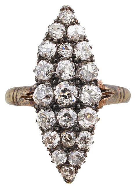 A late 19th century diamond-set panel ringthe navette-shaped plaque set with old brilliant-cut diamonds to the fleur de lys-shouldered, shank stamped "18CT"ring size P, 7.8gCondition:Overall condition good.shank possibly slightly off centre and later Bright diamonds: generally SI, a few PK, mostly I/J colour