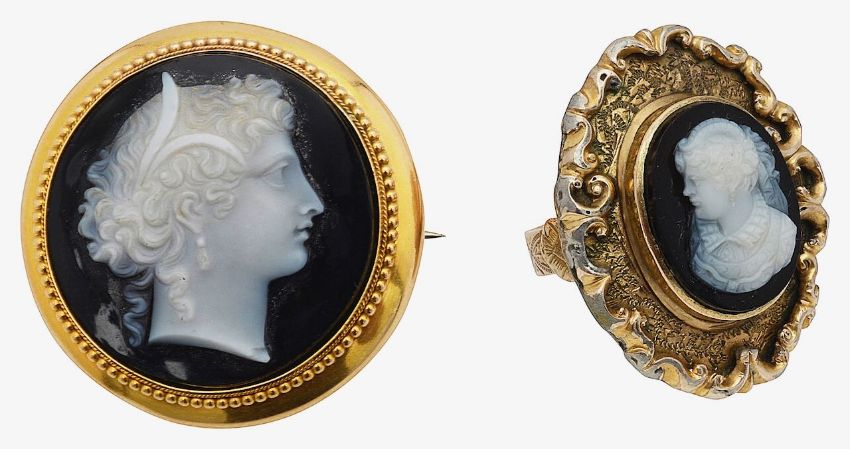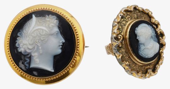 A mid 19th century hardstone cameo broochthe black and white chalcedony roundel depicting the profile of a young lady looking dexter with ornately dressed hair with ornament, to the yellow gold mount applied with spherical bead decoration; together with a hardstone cameo ring, the black and white chalcedony oval plaque depicting in profile an lady in Elizabethan dress, above the scrolling and engraved surround (a/f), and engraved shank with lappets (2)diameter 3.6cm, 17.7g; ring size leading edge K1/2, overall length 3.1cm x width 2.5cmCondition:Brooch: overall condition fair/good - converted from a clasp (still retains tongue sockets to each side so could easily be changed back).Cameo well carved with good detail to eg hair. Minor nick to the right edge of her neck Ring: scrolls and edge worn through in places and with solder repair, shank possibly a replacement
