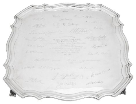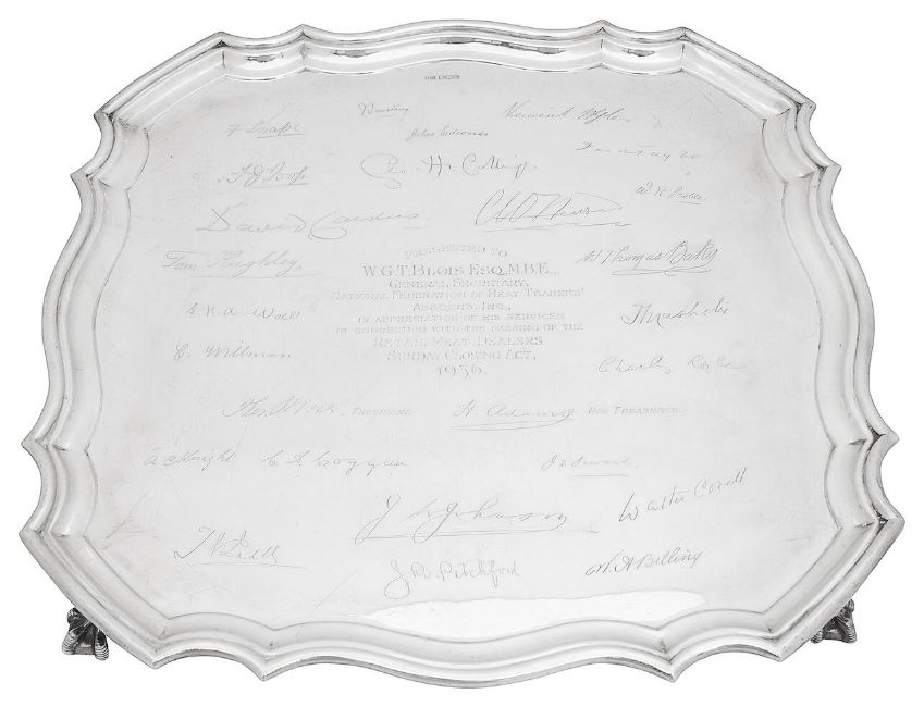 of square form with raised piecrust moulded border, on ball and claw feet, engraved 'Presented to W.G.T. Blois Esq M.B.E., General Secretary, National Federation of Meat Traders' Assocns Inc., in appreciation of his services in connection with the passing of the Retail Meat Dealers Sunday Closing Act 1936 and with facsimile signatures