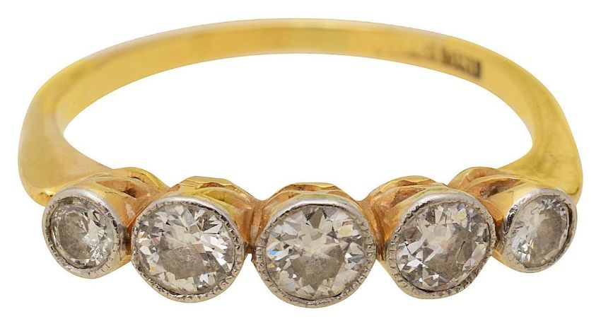 five round brilliant cut diamonds, of slightly graduating size, bezel set to a tapering shank, stamped "18ct"