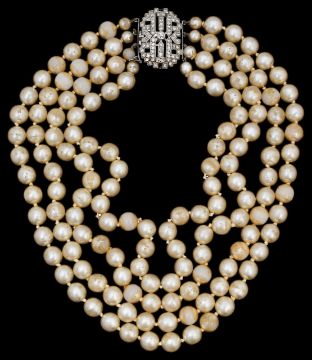 Dame Barbara Cartland. A faux pearl four strand necklace