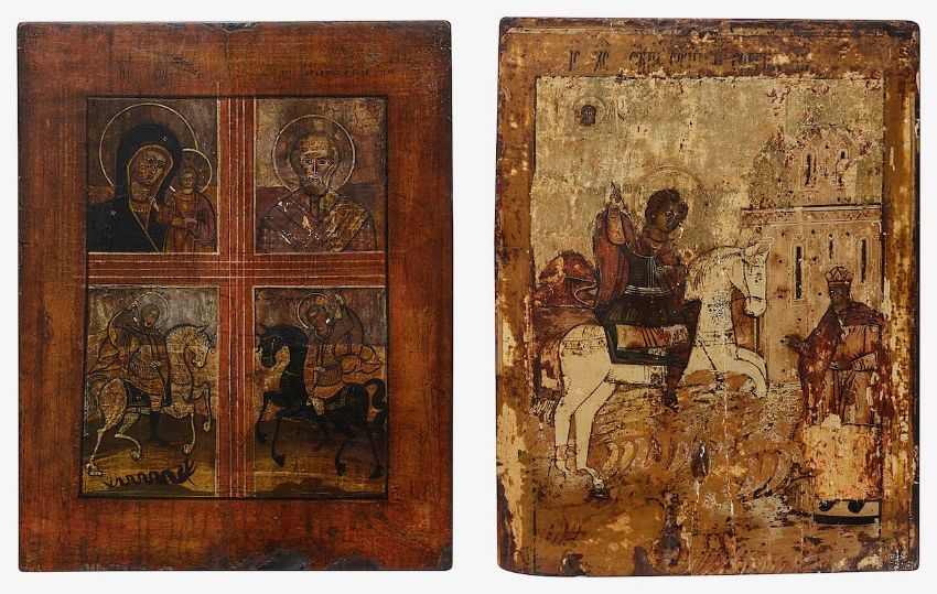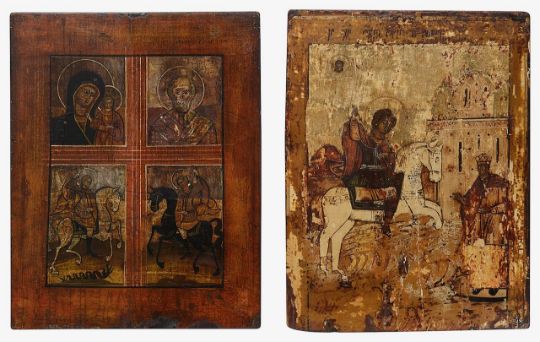 first quadri partite depicting the Mother of God Kazanskaya, St Nicholas, St George and the dragon and St Demetrius, second St George, (2)