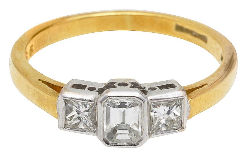 the central rectangular cut-cornered diamond flanked to either side by a square brilliant-cut diamond to the hallmarked tapering shank stamped '.66'