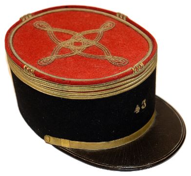 first an Infantry Officers 'Polo' Kepi for the 43rd Regiment with leather peak and soft red crown with Austrian knot, four bands of gold piping for rank of Chef de Batallion (Major), chinstrap fitted above peak fitted with buttons bearing the flaming grenade, black satin lined, second black with leather peak, the crown with Austrian knot, four bands of gold piping for rank of Chef de Batallion (Major), chinstrap fitted above peak fitted with buttons bearing the flaming grenade crossed cannons, relined, (2)