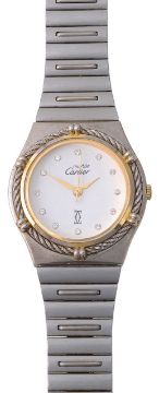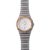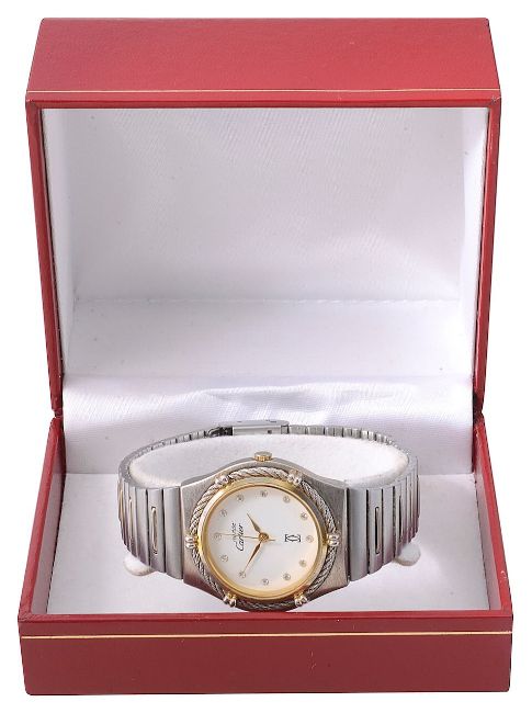 the white dial with diamante dot markers, gilt hands, and rope twist bezel and a stainless steel flexible bar bracelet with clasp, contained in fitted box