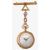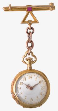 the enamel dial with gilt Arabic numerals, dot markers and filigree hands, the reverse of the case with embossed floral decoration and diamond set, inside of case stamped 18K, suspended by a 9ct chain with a bar brooch stamped 56AP and inset set with diamond and ruby