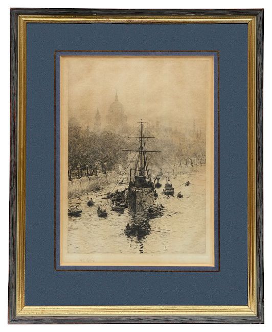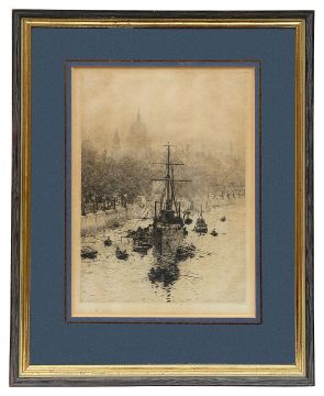 'HMS President lying on her permanent mooring on the Thames', black and white etching, signed in pencil bottom right, mounted, framed accompanied by Quarm (Roger) and Wyllie (John) W.L.Wyllie Marine Artist, 1851-1931, Chris Beetles Ltd, 1981, d.w. signed by both Roger Quarm & John Wylie, (2)
