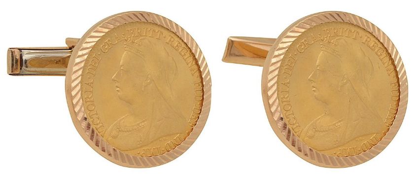 Victorian half sovereign, one dated 1897, veiled head facing left, St George slaying the dragon to rev., within a loose cufflink mount setting, with a chased border, stamped "VI 421-750"