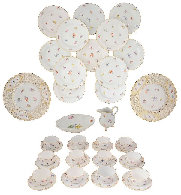 decorated with scattered sprays, shaped gilt edged rims, comprising twelve ogee shaped tea cups, twelve saucers, twelve tea plates, a milk jug, a pair of reticulated cake plates and a shallow dish, underglaze blue crosswords marks, (40)