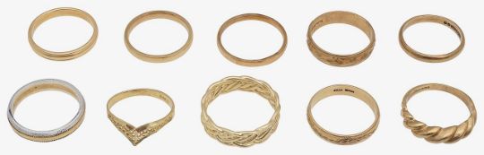 including; five 9ct gold bands, of varying design, stamped with hallmarks; two 9ct gold bands, stamped with British import marks for 9ct gold and two rings, stamped "14K" (9)