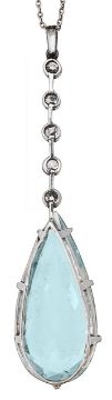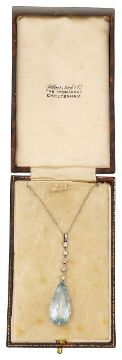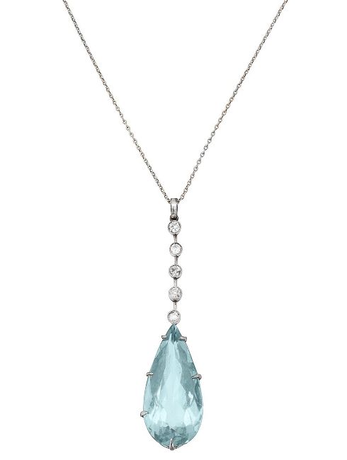 An Edwardian aquamarine and diamond-set pendantthe pendeloque aquamarine suspended from a knife-edge line of five old-cut diamond-set collets, together with a fine trace link chain; contemporary fitted case Pendant: total length 5.5cm, aquamarine 25.0mm x 12.0mm x 8.4mm; 4.7gChain: 1.4gCondition:Overall condition good.Aquamarine: clean, pale sky blue colour.Diamonds: all with culets, mostly single-cuts, two with inclusions, collet settings slightly a/f.